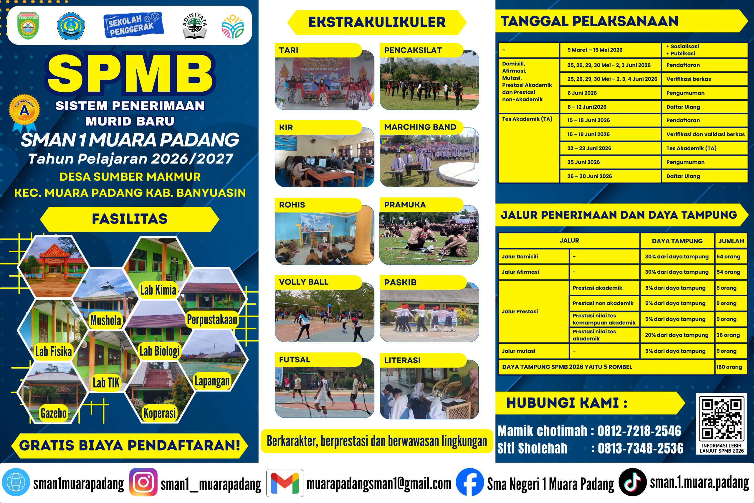 SMAN 1 Muara Padang kembali membuka kesempatan bagi calon murid baru untuk bergabung pada Tahun Ajaran 2026/2027 melalui Sistem Penerimaan Murid Baru (SPMB) yang telah ditetapkan oleh Dinas Pendidikan Provinsi Sumatera Selatan. Penerimaan ini bertujuan untuk menjaring generasi unggul melalui jalur seleksi yang berasaskan prinsip keadilan, transparansi,dan pemerataan akses pendidikan.